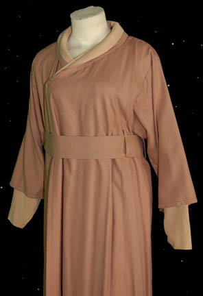 Description: The Bajorans are a humanoid species native to the planet Bajor and were seen throughout the Deep Space Nine series as well as various episodes of Star Trek: The Next Generation and Voyager. This costume was worn by a female Bajoran acolyte during the Star Trek: Deep Space Nine series. The camel color robe has a tan collar, tan under-sleeves and tiny brown spots over it. It fastens at the front with hook and eye fasteners. The accompanying trousers are tan and the belt is matching camel color. Costume comes complete with costume tag.