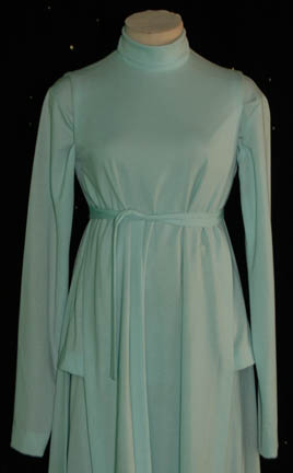 Description: A costume featured in Star Trek III: The Search for Spock for wear by actresses portraying civilians at Starfleet locations. The costume is a light blue long sleeved top with a zip up the spine, trousers with Velcro cuffs at the ankles, and a sleeveless gown. The costumer's tags read ‘Claudia Lowndes as Officer’s Wife, Officer’s Lounge, Sc 77 + 78’ and ‘ENT B FEMALE CIVILIANS’ indicating likely use in Star Trek VII: Generations.