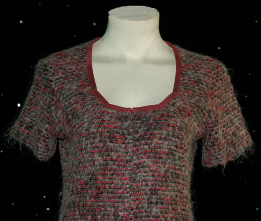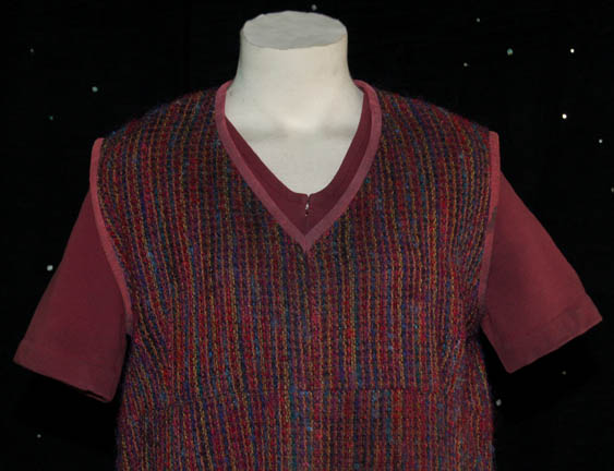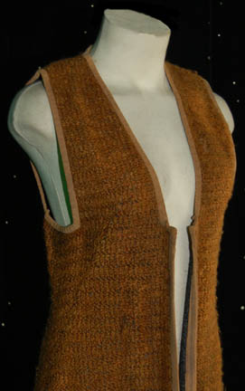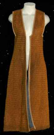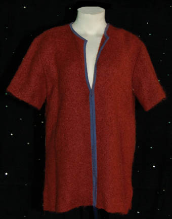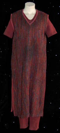 Description: This miscellaneous adult costume lot is from the Star Trek: Deep Space Nine episode “Children of Time” in which the crew of the U.S.S. Defiant discovered a planet where their own descendants were living and that in two days they were going to crash two hundred years in the past. The costume lot includes a brown short sleeved jumpsuit with a zip up the front, two multicolored woven tunics, a woolen mustard colored robe and a woolen rust color top with blue trim. The sewn in tags indicate these costumes were also used during the Star Trek: Voyager series.