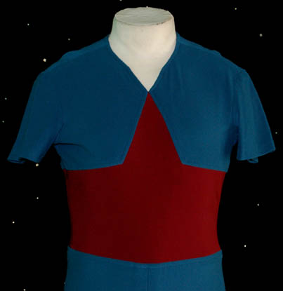 Description: A costume featured on the Star Trek: Enterprise episode "Oasis" for wear by Donald Sage MacKay in the role of the "Shilat" where "Enterprise NX-01" finds a derelict ship with supplies they can use that ends up not being empty. The costume is a short sleeved, full-size, indigo jumpsuit with a red stripe in the middle, a zipper up the back and stirrups for the feet. A sewn in tag reads 'Enterprise, Donald Sage MacKay' and the costumer's tag reads 'Enterprise #20, Kantare Aliens'.