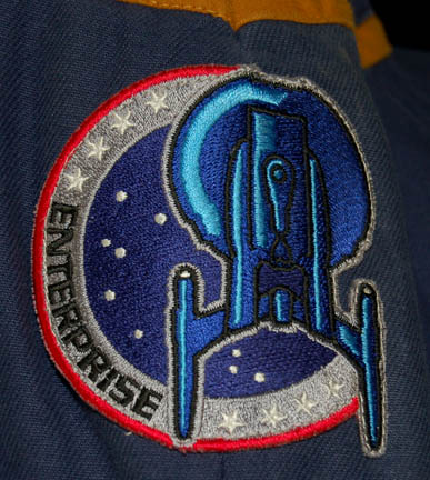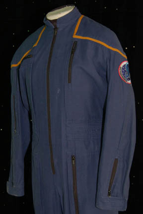 Description: A costume featured in various episodes of Star Trek: Enterprise. The uniform is a standard 22nd century Starfleet issue for a command officer which is a full-length blue jumpsuit with seven functional, zippered pockets, zipper/Velcrocuff adjustment for the wrists and ankles, Enterprise patch on the shoulder, a black sleeveless undershirt. A sewn in tag reads ‘Enterprise, Adam Barnhart'.