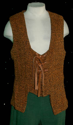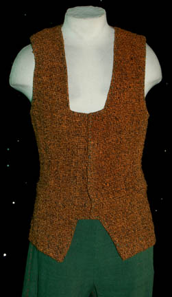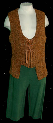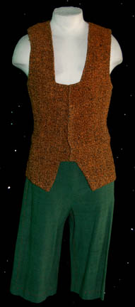 Description: “Vinod” (Michael Silver) was the son of the Human “Alixus” (Gail Strickland) who believed that humanity had lost its way to technology. Vinod was intentionally stranded on a planet with his mother and the people of a colony ship in order to teach the people the evils of technology. Featured in the Star Trek: Deep Space Nine episode “Paradise”, Vinod and Alixus were taken from the colony by “Commander Sisko” (Avery Brooks) and “Miles O'Brien” (Colm Meany) to answer to their crimes. This costume lot includes the stunt costume also. There are two orange and black woven waistcoats with green stitched trim. One has snaps at the front, the other has brown leather ties. Two pairs of cropped green trousers accompany the waistcoats, each with rose color stitched trim. Costumes come complete with costume tag. The sewn in tag indicates this costume was also used during the Star Trek: Voyager series.