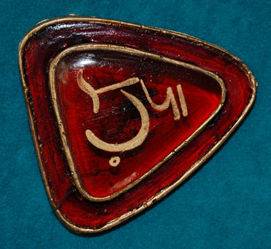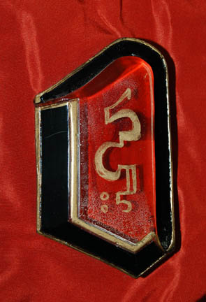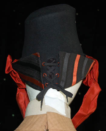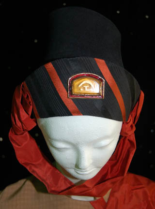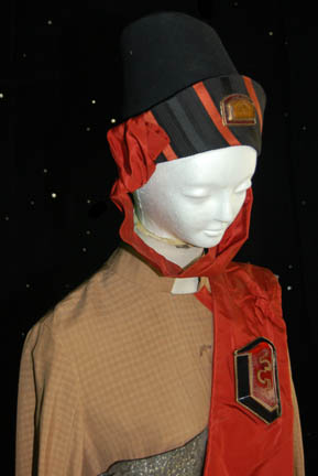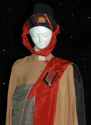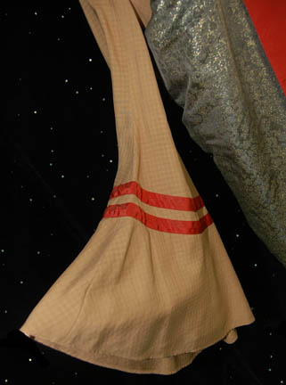 Description: A Vulcan costume composed of a tan robe with orange trim and stripes on the bell shaped sleeves, with a gold colored drape that has orange trim and a large resin badge with Vulcan lettering painted in gold. The costume also comes with an unattached similar resin badge and a black felt hat with red and black accents and a resin badge like the others.