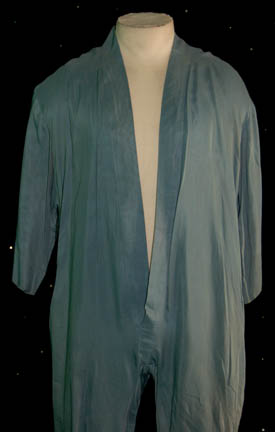 Description: A blue colored science jumpsuit featured in various episodes of the original Star Trek series. The costume is a cropped sleeved jumpsuit with a wide open v- neck extending to the waist. The sewn in tag is inscribed simple ‘11'.