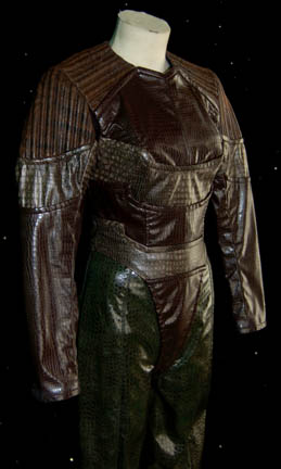 Description: A costume featured in several episodes of Star Trek: Enterprise, "Proving Ground" and "Babel One" and "United", for the Andorian character "Lieutenant Talas" (Molly Brink), First Officer to "Shran" (Jeffrey Combs) aboard the Andorian Imperial Guard ship "Kumari". The costume is a long sleeved blue undershirt, a full length jumpsuit half spandex type material and half green snakeskin pattern vinyl, brown striped vinyl jacket with the snakeskin and textured patterns with zippers on the cuffs and down the back, and distressed black leather boots. A matching scanner pouch is also included. A sewn in tag reads 'Enterprise, Molly Brinks, #065' and the costumer's tag reads 'Enterprise #65, Talas (Andorian), Molly Brinks, Multiple episodes'.