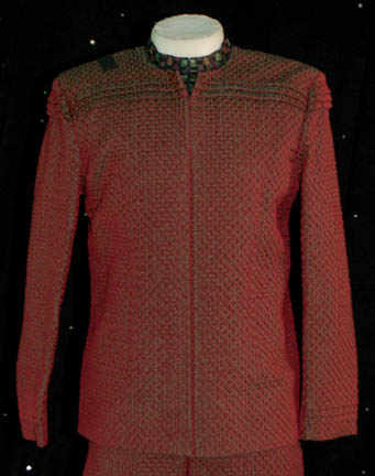 Description: A costume featured on the Star Trek: Enterprise episode "Precious Cargo", where “Enterprise NX-01” rescues a cargo ship with a woman named "Kaitaama" (Padma Lakshmi) in stasis and "Chief Engineer Charles 'Trip' Tucker" accidentally opens her stasis cell, for Mast Alexander in the role of one of Kaitaama's guards. The costume iridescent maroon long sleeved jacket with a diamond shaped pattern, a multi-colored dickie, zipper down the front, and corresponding trousers with stirrups for the feet. A sewn in tag reads 'Enterprise, Mast Alexander'.