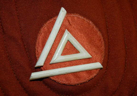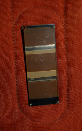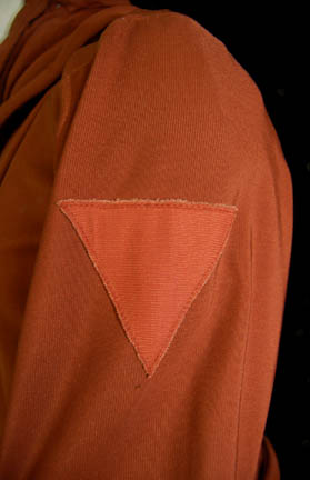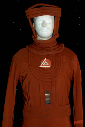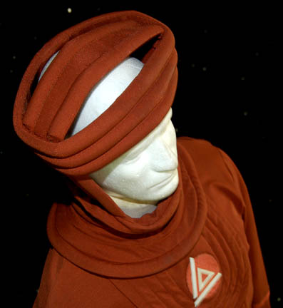 Description: A costume featured in Star Trek I: The Motion Picture for wear by engineers in the tram station where an arriving “Admiral Kirk” (William Shatner) met “Commander Sonak” (John R. Kamal). The costume is a rust brown colored jumpsuit with ringed cuffs and ankles, a headpiece, and sewn on resin accents on the chest and belly.