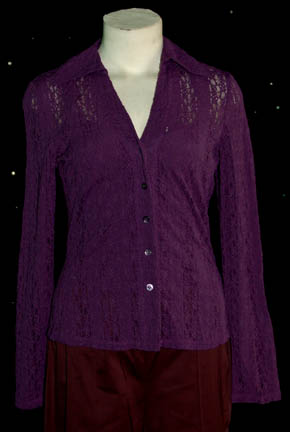 Description: A costume featured in the Star Trek: Enterprise episode "Bound", for wear by Crystal Allen in her role as "D'Nesh", where three Orion Slave Girls are given to "Captain Archer" (Scott Bakula) in an attempt to sabotage the ship and turn him over to the Orion Syndicate. This costume change appears after Captain Archer ordered that they "put on some clothes" and is a purple tank top, purple mesh-type over shirt, and darker purple corresponding pants. A sewn in tag reads 'Enterprise, Crystal Allen'.