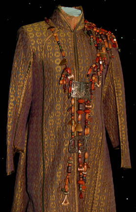 Description: A costume featured on the Star Trek: Enterprise episode "Vox Sola" where a symbiotic alien stows away and captures several of "Enterprise NX-01's". The situation is resolved by locating the alien ship from which the entity came, the Kreetassans. The costume is a long sleeved brown shirt with an iridescent gold checkered pattern and turtle neck, copper colored iridescent pants, and leather shoes. The robe is also a brownish iridescent color with an intricate circular pattern and amazing wood, metal, resin, and plastic beadwork of all shapes and sizes sewn onto the right shoulder that hangs down the front and back and there is an extra string of beads to hang around the neck. A sewn in tag reads 'Enterprise, Louis Ortiz' and the costumer's tag reads 'Enterprise #022, The Needs of the One (working title at the time), n.d. kreetassan, Louis Ortiz'.