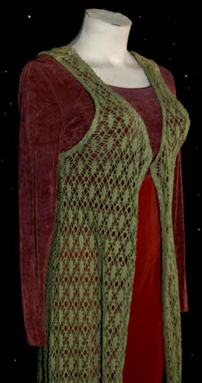 Description: A costume featured in the Star Trek: Deep Space Nine episode ‘Necessary Evil” for wear by Nana Visitor in her portrayal of “Kira”. The costume is a brown shirt attached to rust colored velour trousers with a moss green sweater vest, and brown colored leather boots with patterned vinyl accents on the shins and calves. The costume features a faded Deep Space Nine tag that reads ‘Nana Visitor' while the boots were located in a case inscribed ‘Nana Bajoran Militant brown knees high boots trimmed’. The costumer’s tag reads ‘DS9 Necessary Evil, Kira, Nana Visitor’ and indicates the components.
