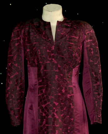 Description: “Kellin” (Virginia Madsen) was a Ramuran female who fell in love with “Lt. Commander Chakotay” (Robert Beltran) after she was beamed onboard the U.S.S. Voyager after her ship was destroyed in the Star Trek: Voyager episode “Unforgettable”. She was unable to stay with Chakotay and returned home to Ramura. Her costume lot includes two sleeveless dark purple jumpsuits with built-in feet and a zip up the back. A purple patterned dress with solid purple satin sides and zips at the cuffs. The bottom of the dress is tapered into a curved base that is longer in the back. A single pair of matching tights is also included. Costume comes complete with costume tag.