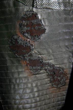 Description: This alien costume was featured in the Star Trek: Voyager episode “Friendship One” in which the crew of the U.S.S. Voyager were sent on a special mission to locate a missing 21st century Earth Probe called ‘Friendship 1' lost in the Delta Quadrant. It was located on the planet Uxal where the people had experienced mass radiation poisoning on the planet following experiments laid out in the information the probe carried. The full length coat is made of eclectic pieces of vinyl with metal rivets and metal snaps up the front. A faux radiation mask and matching gloves are also included. Costume comes complete with costume tag.