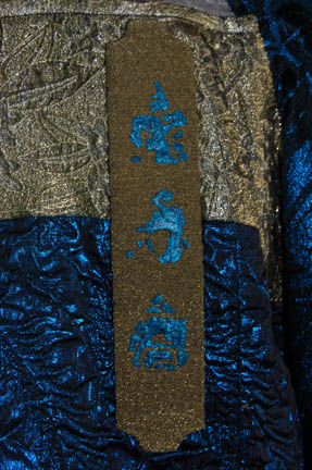 Description: A costume featured in the Star Trek: Deep Space Nine episode “Move Along Home” for wear by “Falow” (Joel Brooks), leader of an alien contingent visiting the station who began a game with “Quark” (Armin Shimerman) that took a very real turn for some of the station crew. The costume is a metallic blue jacket with sparkling gold colored fabric on the chest, silver colored neck and shoulders, a navy colored jumpsuit with affixed to the jacket, and a silver-blue iridescent apron. The chest of the jacket features a gold colored fabric badge with metallic blue alien lettering. The costumer's tag reads ‘410 DS9 “Sore Losers”, FALOW, Joel Brooks’ and indicates the components. “Sore Losers” was the title of the episode before it was adapted to “Move Along Home”.