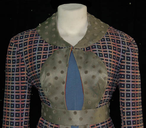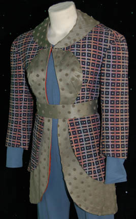 Description: A costume featured in the Star Trek: Deep Space Nine episode “The Maquis, Part I” for wear by “Kobb” (Amanda Carlin), a Federation colonist who chose to side with the Maquis upon the beginnings of their movements against the Cardassians. The costume is a full length teal jumpsuit with a thick multi –layer jacket worn over it. The jacket features an almost plaid pattern with an interior layer of polka-dot pattern extending to become the trim around the neck. A matching belt is also present. The costumer's tag reads ‘DS9 #440, #441, Kobb, Amanda Carlin’.