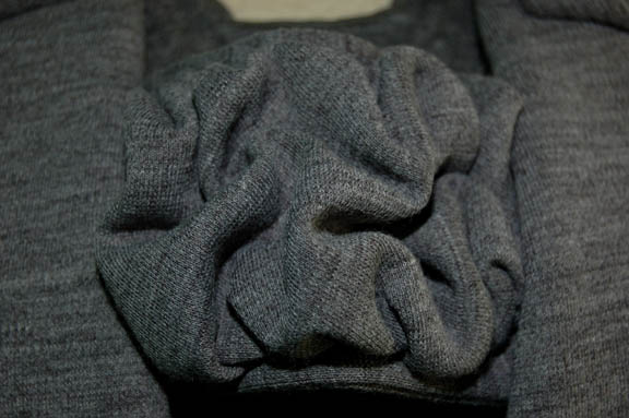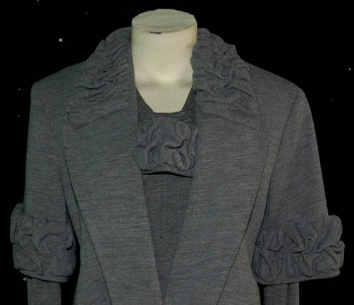 Description: A costume featured in the Star Trek: The Next Generation episode “Forces of Nature”, wherein the “Enterprise-D” meets two scientists who claim the use of high warp is destructive to the fabric of subspace. The costume is for wear by Margaret Reed in the role of “Serova”, the lead scientist claiming the destruction of subspace, and is gray, full-length, long-sleeved jumpsuit with zip/clasp cuff adjustment at the wrists, stirrups for the feet, and a gray jacket with a ruffled collar and cuffs. The costumer's tag reads ‘#261 TNG Forces of Nature, Serova, Margaret Reed’.