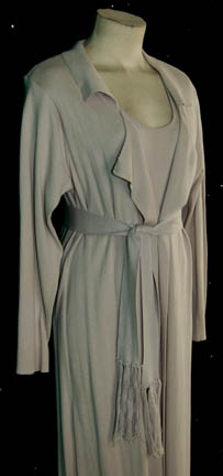 Description: A costume featured in the Star Trek: Deep Space Nine episode “Body Parts” for wear by Rosalind Chao in her portrayal of “Keiko O'Brien” following the relocation of her unborn child to “Major Kira” (Nana Visitor) during a shuttle accident and subsequent transporter incident. The costume is a full length sleeveless gown with a matching over robe and a tassel ended belt. Both garments feature Deep Space Nine tags reading ‘Rosalind Chao’ and the costumer’s tag reads ‘DS9 #497, Keiko, Rosalind Chao’.