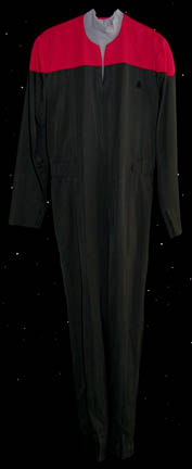 Description: “Q (Junior)” was played by Keegan de Lancie, the real life son of John de Lancie who also played his onscreen father “Q” in the Star Trek: Voyager episode “Q2”. Q (Junior) was sent by his father to stay onboard the U.S.S. Voyager in the hopes that he would learn some of the Starfleet crew's Human virtues and avoid being banished from the Q Continuum. This is his impressive costume collection from the “Q2” episode that includes his Starfleet uniform; a black jumpsuit with command red shoulders, adjustable internal waistband and a zip up the front. There are also loops around the waist and a small Velcro patch for a Combadge to attach (not included) on the left side of the chest. Two gray long sleeved undershirts with zips up the back are also included. The second costume is Q (Junior)’s gray workout jumpsuit with puckered fabric, a command red band around the upper torso, internal adjustable waistband and a zip up the front. A lightweight gray short sleeved top is worn underneath. The workout jumpsuit comes complete with gray running shoes. The sewn in tags read “Voyager – Keegan de Lancie”. The costumes come complete with costume tags.