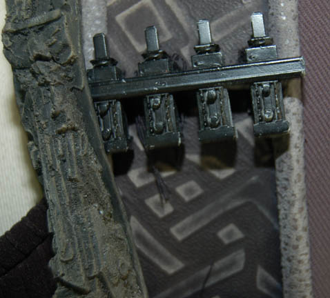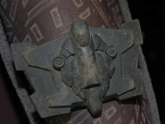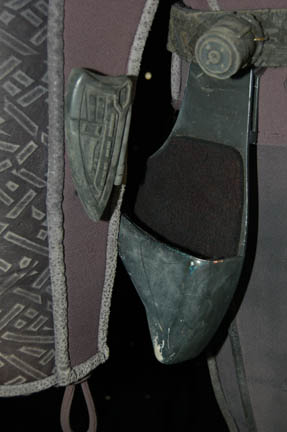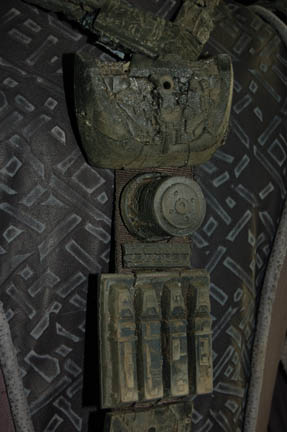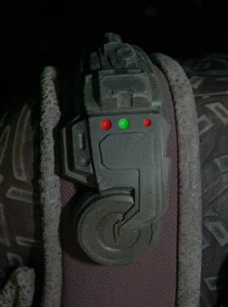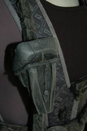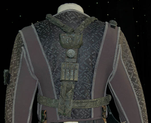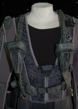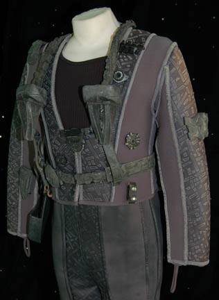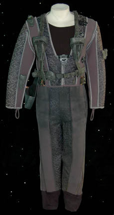 Description: A costume featured in various episodes of Star Trek: Deep Space Nine for actors portraying Jem'Hadar soldiers. The costume is a gray neoprene jumpsuit with a jacket top, both featuring patterned leather and gray piping accents. The jacket features multiple black Velcro placements for various resin and rubber details, and affixed leather belt keepers for an accompanying belt-harness. The belt-harness is made from black nylon with affixed molded rubber and foam rubber accents, and includes a vacuum formed plastic holster. The sewn in Deep Space Nine tags indicate use by various actors.