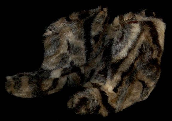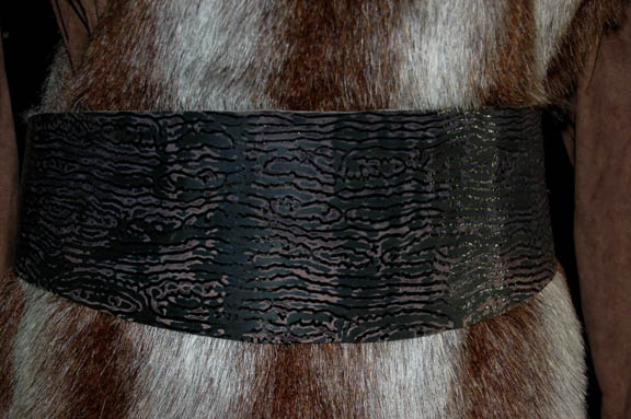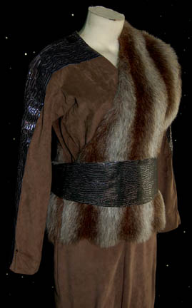 Description: A costume featured in the Star Trek: The Next Generation wherein the “Enterprise-D” is chasing some Ferengi marauders and both ships are caught by a strange energy dampening on a nearby planet. This episode marks the first appearance of the Ferengi as a race in the Star Trek canon. The costume is a full-length, long-sleeved, brown leather jumpsuit with striped, iridescent, black vinyl on the shoulders, down the sleeves, and stirrups for the feet, a fur sarong, fur-lined boots, a tan web belt, and a sash of black, striped vinyl to go over the belt. A costumer's tag reads ‘The Last Outpost, Kayron – Ferengi, Tracy Walters’.