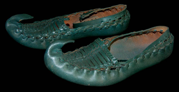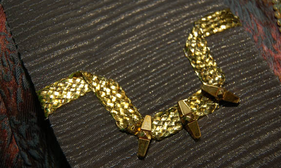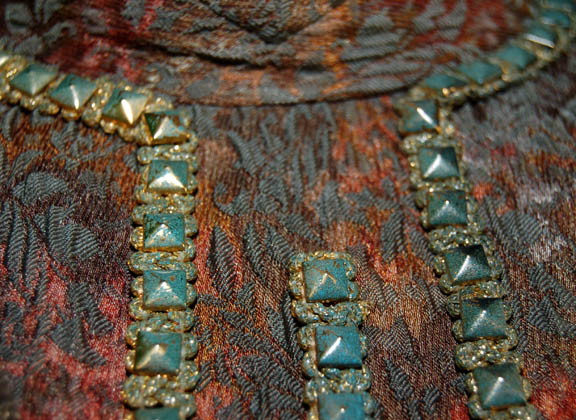 Description: A costume featured on the Star Trek: The Next Generation episode “A Perfect Mate” wherein “Captain Picard” (Patrick Stewart) is a host between two warring planets and finds himself uncontrollably attracted to a empathic metamorph that shall be presented to the leader of one of the factions as a gift. This costume was for wear by Mickey Cottrell in the role of the faction leader who was to receive this great gift, “Alrik”. The costume is a long sleeved tunic of embroidered green leaves over a floral pattern of reds and yellows, green and yellow jeweled accents down the front and around the collar, clasp/zip cuff size adjustment, and a zip up the back. There are corresponding overall style trousers the same color as the leaf embroidery, stirrups for the feet, an iridescent brown sash with gold colored accents, and a pair of blue-green shoes with upturned toes. A sewn in tag reads ‘Micky Cottell' and the costumer’s tag reads ‘221 The Perfect Mate, Alrik, Mickey Cottrell’.