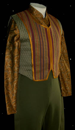 Description: A costume featured in the Star Trek: Deep Space Nine episode “Little Green Men” for wear by Max Grodenchik in his portrayal of “Rom”. The costume is a full length sleeveless, green jumpsuit with flairs on the outer seems, a gold patterned long sleeved shirt with a mandarin style collar, and a quilted diamond pattern vest with gold colored trim and a stripe patterned chest. The costume is missing a jacket as per the costumer's tag inscribed ‘DS9 Rom, Max Grodenchik, “Little Green Men”’. The jacket could not be located.