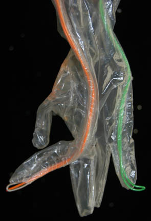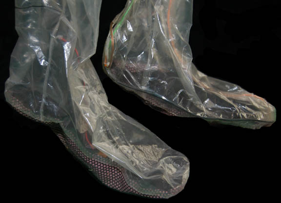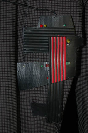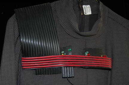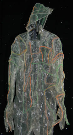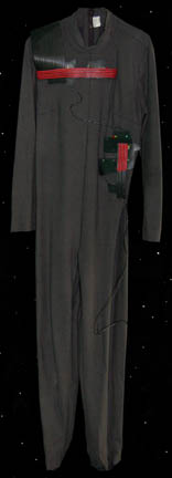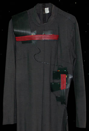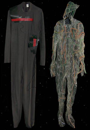 Description: “Species 6339” were a race almost completely assimilated by the Borg and were featured in the Star Trek: Voyager episode “Infinite Regress” in which they introduced an artificial pathogen that attacked the Borg's vinculum. The costume includes two jumpsuits. The first jumpsuit is gray with a small squared pattern and rubber components on the right shoulder, across the chest and left side of the body. The components are black with red stripes and feature numerous multicolored LED lights. Worn over it is a secondary jumpsuit made of lightweight clear plastic with green, orange and clear wires sewn in over its entirety. It has built in feet and gloves and a zip up the back. A clear wired cowl is also included. Due to time and use the plastic jumpsuit is ripping in several places and the electronics on both jumpsuits no longer appear to work.