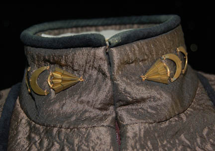 Description: A costume featured in the Star Trek: Deep Space Nine episode “Inter Arma Enim Silent Leges” for wear by veteran Star Trek actor John Fleck as “Minister Koval”. The costume is wood-grain patterned trousers with a matching jacket top with black piping accents and a black Dry-deck belt that features an affixed gold painted resin Romulan Star Empire bird of prey badge serving as a ‘buckle' as the belt fastens in the rear. The collar of the costume also is adorned with brass colored metal crescents and flairs representing Romulan ranks. The costumer’s tag reads ‘#565 DS9 “Inter Arma Enim…”, Koval, John Fleck, Romulan’, another tag indicates ‘change 2’, and the sewn in Deep Space Nine tag reads ‘John Fleck’. Fleck portrayed several alien characters in various Star Trek series, most notably ‘Silik’ the Suliban in Star Trek: Enterprise.
