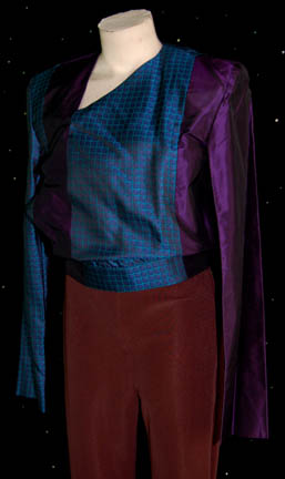 Description: A costume featured in the Star Trek: Deep Space Nine episode “Fascination” for wear by Siddig El Fadil in his role as “Dr. Bashir”. The costume is a pair of blue and purple silk shirts, both iridescent with a folded down front, and brown trousers. The costumer's tag reads ‘DS9 – 456 – “Fascination”, BASHIR, Siddig El Fadil” and states the contents, while the sewn in Deep Space Nine tags read ‘Siddig El Fadil’.