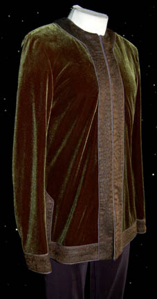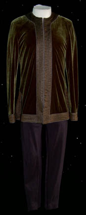 Description: The Ramurans are a humanoid species from Ramura who are capable of producing a unique pheromone that affects other species by making them forget their encounters with the Ramurans within hours of contact. This Ramuran costume lot includes two costumes from the Star Trek: Voyager episode, “Unforgettable” in which “Kellin” (Virginia Madsen), a Ramuran female fell in love with “Lt. Commander Chakotay” (Robert Beltran) after she was beamed onboard the U.S.S. Voyager after her ship was destroyed. She was unable to stay with Chakotay and returned home to Ramura. One costume was worn by the Ramuran “Curneth” (Michael Canavan) and the other by “Reskat” (Chuck Magnus). Both tops are made of velvet, one is brown with blue and purple trim, the other is dark green with brown and blue trim. Both have zips up the front and are each accompanied by their corresponding black trousers. Costumes come complete with costume tags.