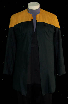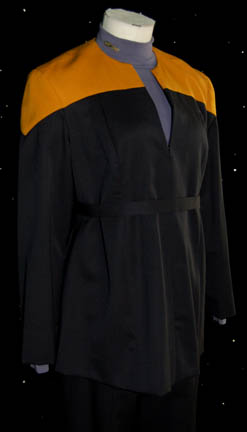 Description: “B'Elanna Torres” (Roxann Dawson), half-human and half-Klingon, was Chief Engineer onboard the U.S.S. Voyager during the Star Trek: Voyager series. This is her maternity Starfleet uniform lot from when she was pregnant with her and “Tom Paris’” (Robert Duncan McNeill) first child, “Miral” (Lisa LoCicero). The uniform lot includes a black maternity top with operations gold shoulders, a zip up the front and flared lower section. Two pairs of black Starfleet trousers with stretch maternity waistbands and a gray long sleeved undershirt are included. The right side of the undershirt’s collar has two small snaps for the metal Marquis rank bar to attach. A black Starfleet jacket with operations gold shoulders, three pleats up the back, internal adjustable waistline and sewn in small weights to keep the jacket hanging properly. The costume also comes with a thin black belt. All the costume pieces have sewn in tags that read “Voyager – Roxann Dawson”. Costume comes complete with costume tag.