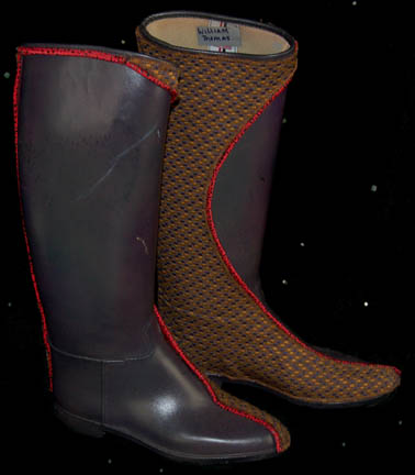 Description: A costume featured in the Star Trek: The Next Generation episode “Preemptive Strike”, wherein “Lieutenant Ro Lauren” (Michelle Forbes) tries to infiltrate a Maquis cell. This costume is for wear by William Thomas Jr. in the role of “Santos”, the member of the Maquis that takes Ro to meet the rest of the cell. The costume is a full-length, long-sleeved brown jumpsuit, zip down the back, stirrups for the feet, a two-tone purple and orange/purple zigzag tunic, a decorative sash of the same purple and purple leather boots accented with the same zigzag pattern as the tunic. The jumpsuit, tunic, and sash, all three, have the same red piping with black spots. A sewn in tag reads “Star Trek: TNG, Mr. WM. Thomas' and the costumer’s tag reads ‘276 The Good Fight, Santos, William Thomas Jr.’. The episode was originally named “The Good Fight” but it was felt that that name would be too similar to the series finale “All Good Things…”.