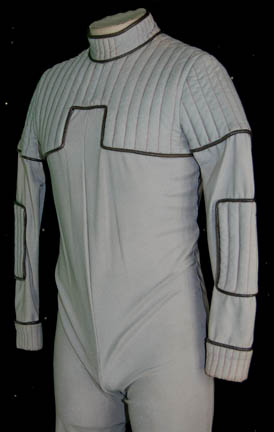 Description: A costume featured in the Star Trek: The Next Generation episode “Bloodlines” wherein “Captain Picard” (Patrick Stewart) finds that he has a son and his life is being threatened by a Ferengi from Picard's past. The costume is for wear by Ken Olandt in the role of “Jason Vigo”, son of “Captain Picard”, and is a gray jumpsuit, brown piping, reinforced quilting, stirrups for the feet and a zip up the back. The costumer’s tag reads ‘274 Bloodlines, Jason Vigo, Ken Olandt’.