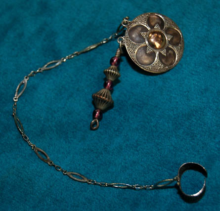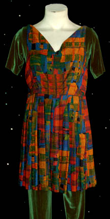 Description: A costume featured in the Star Trek: Deep Space Nine episode “You are Cordially Invited” for wear by Chase Masterson during her portrayal of “Leeta” while attending the bachelorette party of “Jadzia Dax” (Terry Farrel). The costume is a v-neck dress with muli-geometric shape pattern and a green jumpsuit. The costume also comes with one of “Leeta's” Bajoran earrings. The costumer’s tag reads ‘DS9 #531, Leeta, Chase Masterson’ and indicates the components.