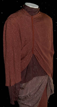 Description: A costume featured in the Star Trek: Deep Space Nine episode “The Search” for wear by Star Trek veteran actor John Fleck” in his portrayal of “Ornithar”, a representative of the Dominion. The costume is a three tone brown and black tunic with trousers. The tunic is made from textured fabric with bunching along the right breast due to an attached trim. The costumer's tag reads ‘447 The Search, Ornithar, John Fleck’ and indicates the components, a sewn in tag in the trousers reads ‘John Fleck’ and another tag indicates further use by another actor. John Fleck portrayed aliens in all of the 24th century Star Trek series but perhaps most notably played “Silik” the Suliban temporal agent in Star Trek: Enterprise.