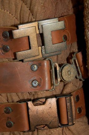 Description: A costume featured in the Star Trek: The Next Generation episode “Brothers” wherein “Commander Data's” (Brent Spiner) creator summons him to the planet his lab is on to give him a gift but Data’s brother “Lore” (Brent Spiner) shows up and steals it. The costume is a long-sleeved, tan, woven shirt with red collar and sleeves, brown, overall style, textured trousers, zip and buckled cuff adjustment, and a brown vest, a buckle on the left side of the collar, reddish piping one the edges and tri-belt around the waist. The costumer’s tag reads ‘#177 TNG Brothers, Lore Dbl, Dana Vitatoe’.