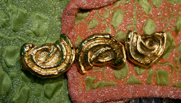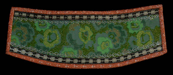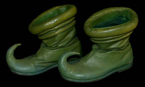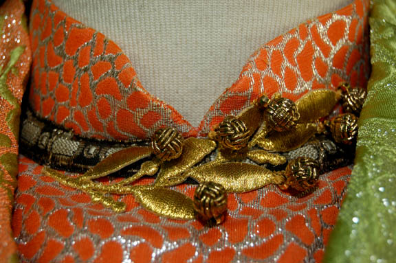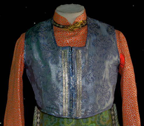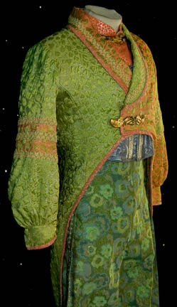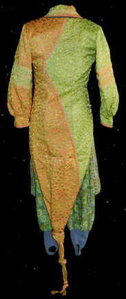 Description: “Kol” (Leslie Jordan) was a Ferengi shuttle pilot who was controlling the economy of a primitive world to gain obscene amounts of profit illegally with a second Ferengi in the Star Trek: Voyager episode “False Profits”. This costume was worn by his stunt double and includes a green, teal and silver patterned sleeveless jumpsuit with a blue top section and Ferengi style wings down the side of each leg. The wings have silver cord and ribbon sewn onto them. A cropped long sleeved orange top with silver patterning, embroidered gold leaves at the collar and seven gold colored metal decorations. The underarms are solid orange. A cropped blue and silver patterned waistcoat with silver colored metal bars down the front either side of the Velcro fastening. An impressive cropped coat is the final layer, made of orange and silver fabric with a green leaf motif on the left side and green on green fabric on the right. The coat tapers down into a stylized triple knot at the bottom, ending with two tassels. Three beaded ribbon bands are on each sleeve and down the collar. Three gold colored jewelry pieces cover the snap fasters at the front. A matching Ferengi head wrap and green painted pixie-toed boots completes the costume. Costume comes complete with costume tag.