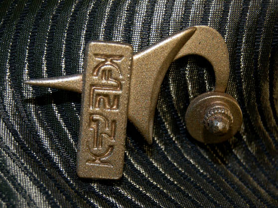 Description: “Devro” (Robert Greenberg) was a member of the Hierarchy species and featured in the Star Trek: Voyager episode “Tinker Tenor Doctor Spy”. He was second in command to “Dr. Phlox” (John Billingsley) during a reconnaissance mission to find ships that were easy targets for stealing technology. The costume includes a black and silver wave pattern top with leather cuffs. A matching padded collar Velcro's over the top that has a resin decoration on it. Matching trousers are included and a leather harness with gun holster. The accompanying gun has a hard foam handle and a gold colored metal barrel. Costume comes complete with costume tag. A secondary tag indicated this costume was also used in the Star Trek: Voyager episode “Renaissance Man” by “Zet” (Wayne Thomas Yorke) who was also a member of the Hierarchy species.