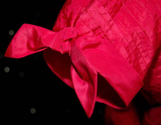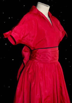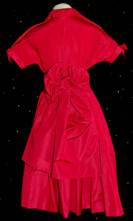 Description: A costume featured in the Star Trek: Deep Space Nine episode “Far Beyond the Stars” for wear by “Cassie” as portrayed by Penny Johnson, parallel to her typical role as “Kasidy Yates”. As part of a (possible) illusion experienced by “Captain Sisko” (Avery Brooks) due to the ‘Bajoran Prophets', Sisko believed he was a black man in Harlem, New York City, in 1953, discriminated against because of his race. In the fantasy, he was engaged to marry “Cassie”, this costume appeared on one of their dates, a red dress with pleating, short sleeve trim with affixed bows, and a wide matching shawl with a black interior lining. The zip up the back is broken, missing a tooth. The sewn in Deep Space Nine tag reads ‘Penny Johnson’.