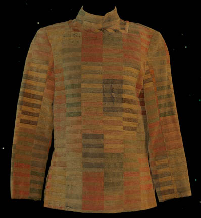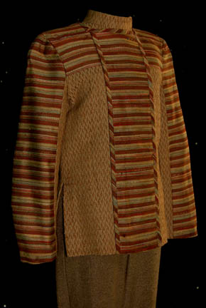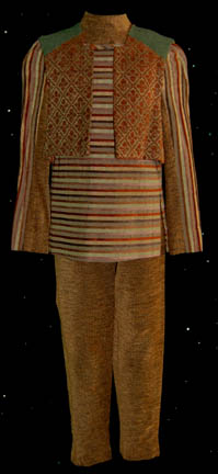 Description: “Brax” (Ian Meltzer) was a Talaxian boy and the only son of “Dexa” (Julianne Christie). He was featured in the Star Trek: Voyager episode, “Homestead” in which he, his mother and five hundred other Talaxians had taken refuge on an asteroid they'd turned into their home. “Neelix” (Ethan Phillips) crash landed on the asteroid and was tended to by Dexa. He befriended the pair and later became Brax’s step-father. This costume collection includes a brown striped top, brown trousers and a brown and tan diamond patterned waistcoat. The waistcoat also has green shoulders. A brown top with earth-tone stripes down each sleeve, across the shoulders and paneled down the front and back. A matching dickie is worn underneath. The accompanying trousers are brown. The last top is pale earth-tone colors in a rectangular blocked pattern. A matching dickie is also included. Costumes come complete with costume tags.