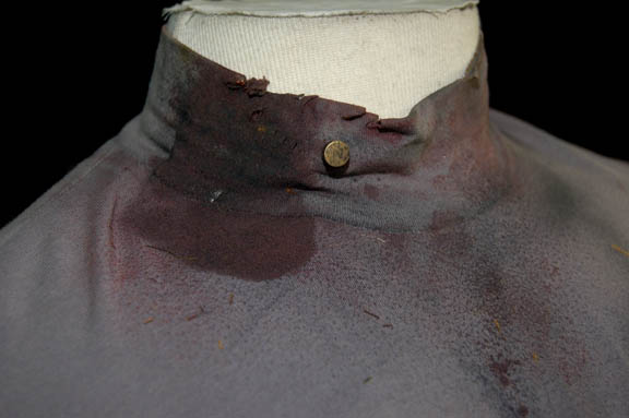 Description: “Harry Kim” (Garrett Wang) was the Operations Manager onboard the U.S.S. Voyager during the Star Trek: Voyager series. This is his distressed Starfleet uniform including a black jumpsuit with operations gold shoulders, adjustable internal waistband and a zip up the front. There are also loops around the waist and a small Velcro patch for a Combadge to attach. The jumpsuit has significant distress to the upper chest, shoulders and left upper sleeve. The gray long sleeved undershirt has faux blood and distress around the neck, torso and sleeves. A single distressed Harry Kim rank pip is attached to the collar. The accompanying distressed Combadge is not believed to be from the costume but is included to add to the distressed effect. The Combadge is missing its Velcro backing and was attached with Topstick to the costume for photographing. The sewn in tags read “Voyager – Garrett Wang”.