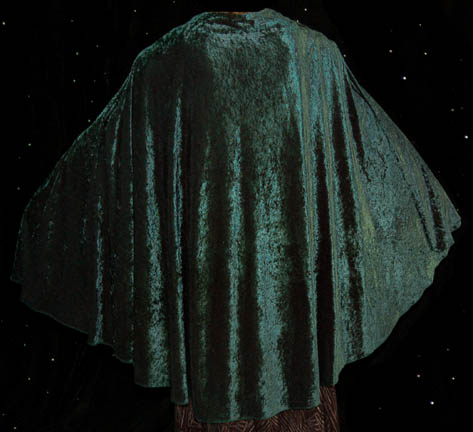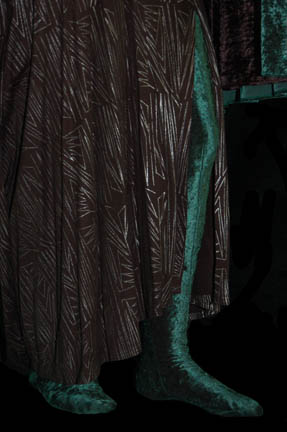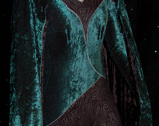 Description: A costume featured in the episode “Necessary Evil” of Star Trek: Deep Space Nine, and “Devil's Due” of Star Trek: The Next Generation. Worn respectively by Katherine Moffat in her portrayal of “Vaatrik Pallra” and Marta Dubois as “Ardra” the costume is a green velour jumpsuit with an affixed black skirt with silver colored zigzag patterns and silver colored piping, with a green velour drape featuring a black velour interior lining, and comes with extra fabric pieces. The costume also features a sewn in Voyager tag and two costumer’s tags indicating wear on Deep Space Nine and The Next Generation.