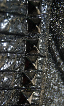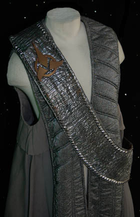 Description: A costume featured in the Star Trek: The Next Generation episode “Sins of the Father” wherein “Lieutenant Commander Worf” (Michael Dorn) goes to the Klingon home world with his brother to challenge a long-standing charge of treason against his father. The costume is a long, gray, sleeveless robe with reflective silver stole, a silver spiked sash, and a large Klingon sigil. The costumer's tag reads ‘165 Sins of the Father, Worf, Michael Dorn’.