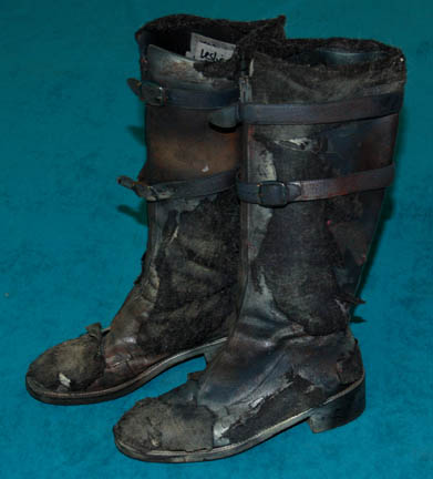 Description: A costume featured in several episodes of Star Trek: Enterprise where “Enterprise NX-01” crew are trying to find and stop a renegade band of “Augments” created by “Arik Soong” (Brent Spiner). The costume is for wear by Abby Brammel in the role of the augment “Persis” and is a full-length sleeveless jumpsuit in an iridescent purple shade with a zipper up the back and stirrups for the feet. The costume has various rips and tears to portray the amount of distress these augments have endured and includes equally distressed knee-high leather boots. A costumer's tag reads ‘Enterprise #080-082, Female Augments’.
