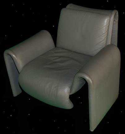 Description: A chair featured in various episodes of Star Trek: Enterprise appearing in the crew quarters of “Commander Tucker” (Connor Trinneer) on the “Enterprise NX-01”. The chair is grey vinyl with a folded appearance to its legs and back with a Velcro placement for the seat and back cushions to stay in place. The item features a tag on the underside inscribed ‘STV' indicating likely use in various episodes of Star Trek: Voyager as well. Item measures approx. 33.5 X 35 X 27 inches.