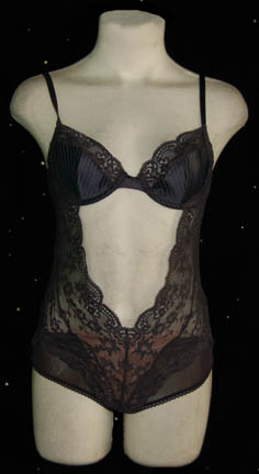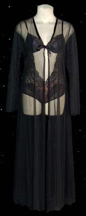 Description: A costume featured in the Star Trek: Enterprise episodes “In a Mirror, Darkly, Parts I and II” for wear by Linda Park in her portrayal of the Mirror Universe version of “Hoshi Sato”. The costume is a racy set of sleepwear, a see-through black robe, and two sets of negligee. The robe and one set are accompanied by costumer's tags reading ‘Hoshi, Linda Parks, “Mirror Universe”’. The bustier features a sewn on ‘Chantal Thomass’ tag reading ‘Linda Park #094’.