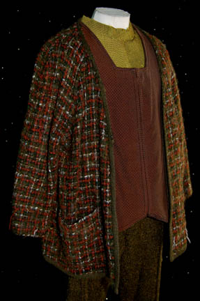 Description: A costume featured in the Star Trek: Deep Space Nine episode “The Wire”, wherein “Dr. Bashir” (Alexander Siddig) attempts to remove a cranial implant given to “Garak” (Andrew Robinson) during his days with the ‘Obsidian Order'. The costume is for wear by Paul Dooley in the role of the onetime head of the Obsidian Order that gave Garak the implant and the man who would later found to be his father, “Enabran Tain”, and is a yellow-green, sleeveless tunic, a brown, woven vest, zip down the front, a woven, wool sweater in an olive plaid design, two functional pockets, corresponding olive colored overall style trousers with stirrups for the feet. A sewn in tag reads ‘Deep Space Nine, Paul Dooley’ and the costumer’s tag reads ‘444 DS9 The Wire, Enabran Tain, Paul Dooley’.