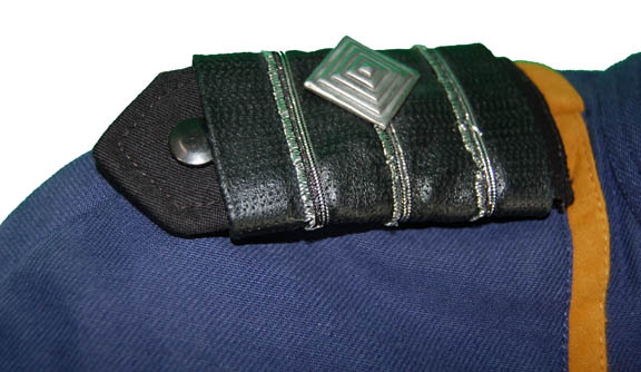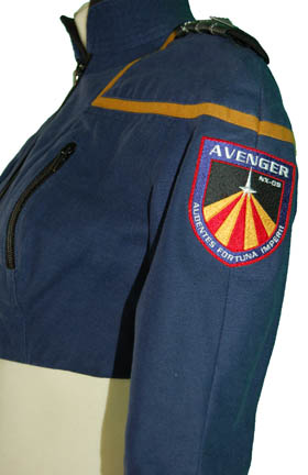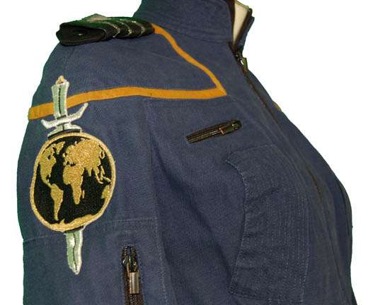 Description: A costume featured in the Star Trek: Enterprise episodes “In a Mirror, Darkly, Parts I and II” for wear by Jolene Blalock in her portrayal of “Commander T'Pol”. The costume is a Starfleet Uniform from the Mirror Universe, thus it is hip hugging cropped trousers with a midriff bearing cropped uniform top with cropped sleeves. The uniform features command gold division strips around the shoulders, black faux leather epaulettes sewn onto the shoulders with corresponding shoulder boards located with the costume appearing as faux black leather boards with three affixed silver colored fringe strips and an attached silver colored metal raised diamond indicating the wearer to be a ‘commander’, a Terran Empire logo patch sewn onto the right sleeve, and an “ISS AVENGER NX-09” assignment patch on the left sleeve indicative of when “T’Pol” was reassigned from the “Enterprise NX-01” in an effort to remove all non-humans from the hijacked “USS Defiant”. The costume features an attached faux black undershirt and multiple zippered pockets, as well as calf length black leather heel boots that zip up the inside which were not located with the costume but which came from the collection of boots acquired to appear on screen as Star Trek: The Original Series style boots in episodes like “Trials and Tribble-ations”. The costumer’s tag reads ‘T’Pol, Jolene Blalock , 2pc. Starfleet Uniform, “Mirror Universe”, and sewn in Enterprise tags read ‘Jolene Blalock’.