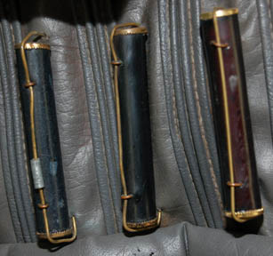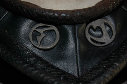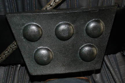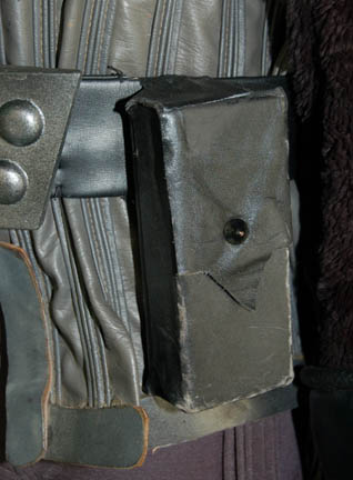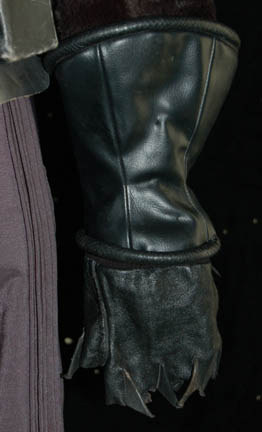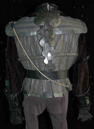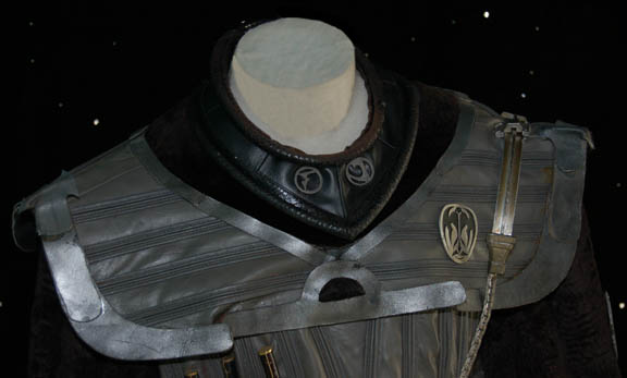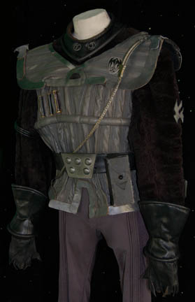 Description: A Klingon costume featured in various Mirror Universe themed episodes of Star Trek: Deep Space Nine. The costume is gray Spandex trousers, gray vinyl uniform top with multiple affixed details and black faux fur sleeves with two Velcro affixed ‘house badges' on the left sleeve and a Velcro placement on the right sleeve. The costume comes with a black leather gorget, metal shoulder aglet and chain for a holster (not present), gauntlets, fingerless leather gloves, a sectioned spine piece for the back, an unattached ‘house badge’ for the right sleeve, and a black leather belt with a resin buckle painted metallic silver, with a black leather ammo case. The costume features an affixed silver colored metal ‘Mirror Alliance’ badge on the left breast depicting an inset bird with shielding wings covering (or hovering over) the emblem of the Klingon Empire. A costumer’s tag reads ‘Klingon Complete’.