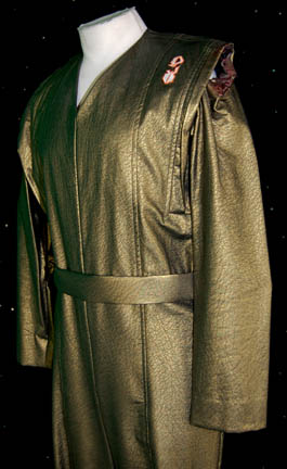 Description: Captured by a massive industrial consortium and brainwashed into believing that they have been part of the employees of this company forever, the crew of “Voyager” wore jumpsuits like this one in the episodes “Workforce, Parts I and II” of Star Trek: Voyager. This is “Chakotay's” (Robert Beltran) shiny green jumpsuit with a matching belt, a zip up the front, and a white and orange sewn in division patch on the left shoulder front depicting ‘Quarren’ character letters. The left shoulder is distressed and has fake blood applied to indicate a wound. The sewn in tags read “Voyager – Robert Beltran”. Costume comes complete with costume tag.