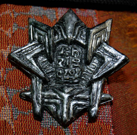 Description: A costume featured in the Star Trek: Deep Space Nine episode “Inter Arma Enim Silent Leges”, wherein “Dr. Bashir” (Alexander Siddig) is on Romulus for a medical conference and learns of a plot by Section 31 to assassinate the head of the Tal Shiar, “Koval” (John Fleck). The costume is for wear by veteran cult actress Adrienne Barbeau in the role of “Senator Kimara Cretak”, the Romulan Representative on DS9 during the Dominion War, and is a full-length, long-sleeved, dress with multicolored stripes, black piping, a floral pattern along the chest, around the collar, and down the right arm, a zip down the back, a pair of metallic copper colored leggings, and a resin cast badge that identifies her as a member of the Romulan Senate. A sewn in tag reads ‘Deep Space Nine, Adrienne Barbeau' and the costumer’s tag reads ‘#565 DS9 Inter Arma Enim…, Cretak, Adrienne Barbeau’.